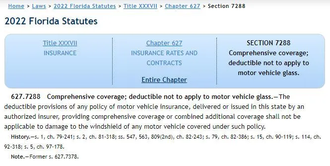 Florida Law (Statute 627.7288) prohibits insurance companies from charging a deductible for all windshield replacement claims filed under comprehensive or full coverage.